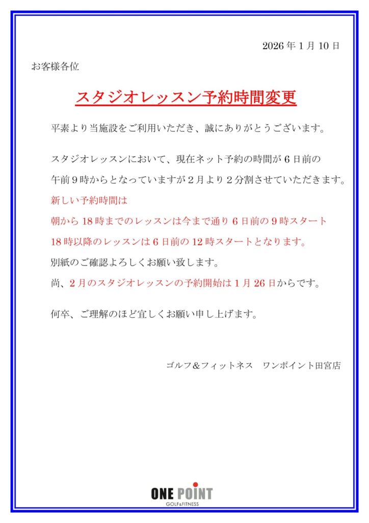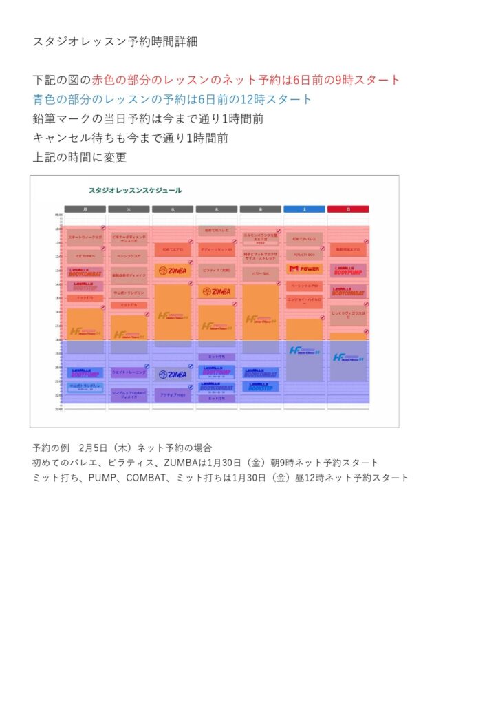 2月よりスタジオレッスンネット予約時間変更
